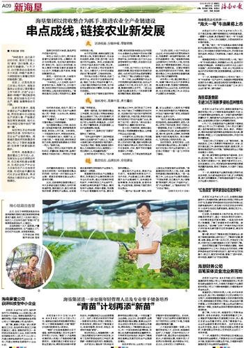 近两年,海垦集团以营收整合工作为切入点,发挥龙头企业引领带动作用,在区域间构建全链整合,达成农业生产中企业大主体与农户小主体有效衔接,形成利益共赢的现代化农业经营体系,串点成线全力推进农业全产业链建设。