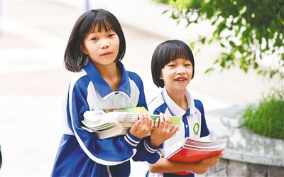 ② 9月1日,琼中黎族苗族自治县高田小学学生领取课本后走回教室。 新华社记者 杨冠宇 摄