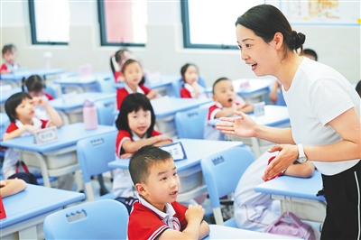 ① 9月1日,开学第一天,北京师范大学海口附属学校一年级7班老师以交通安全教育为主题,为学生们讲授开学第一课。本报记者 封烁 摄
