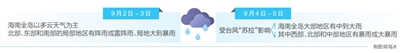 本报海口9月1日讯(记者马珂 张期望 通讯员王旭 云蓓 吴春娃)9月1日,海南日报记者从省应急管理厅获悉,我省组织召开防御台风“苏拉”视频调度会,部署防范应对工作。9月1日下午5时,省气象台继续发布台风四级预警,受“苏拉”影响,9月2日下午至5日,琼州海峡、风力6级,阵风7—9级,北部湾海面、本岛西部和东部海面风力6—7级,阵风8—9级;其余各预报海区风力5—6级,阵风7—8级。4—5日,海南岛有强降雨天气。