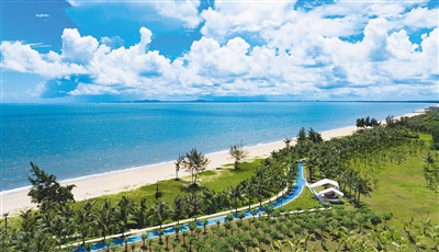 近日,航拍海口江东滨海公园。如今,经生态修复后打造而成的该公园景色宜人,蓝色的自行车道、白色的海边台阶和绿色的椰树相映成趣。目前,海口江东滨海公园已经成为众多运动爱好者的打卡地。本报记者 封烁 摄