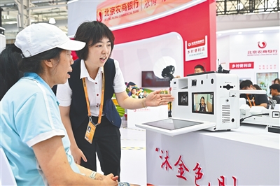 9月3日,首钢园北京农商银行展台的工作人员向参观者介绍一款自主设计的视频银行。新华社记者 李鑫 摄