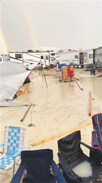 美国内华达州沙漠9月1日连夜降下暴雨,导致交通中断,当地正举行的文化节“火人节”数万名参与者因此受困营地,被要求节约食物、饮用水和燃料。图为营地在暴雨过后一片泥泞。新华社/路透