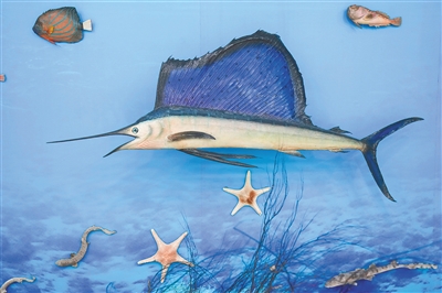置身于海洋展厅,只见一件旗鱼标本呈遨游姿态,被悬挂在空中。它的周围,玳瑁鹰如喙一般的嘴微张,被人称为“全能杀手”的长尾鲨呈现捕捉猎物的形态,恍惚间,参观者仿佛闯入了一个水下世界。该展厅共有展品212件(套),主要包括海洋生物资源、海洋文化艺术遗存、出水文物等。