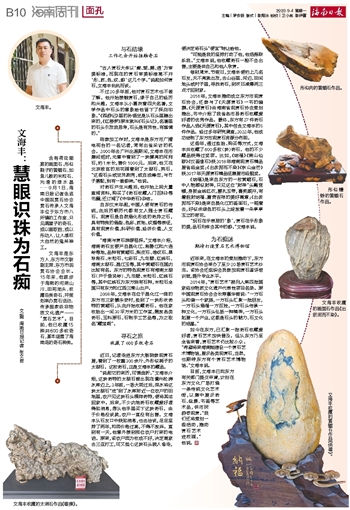 文海丰是东方人,东方市文联副主席、东方市观赏石协会会长。15年来,他跋涉于海南的河湖山川、田间地头,收藏各类奇石,并策划举办赏石活动,传承国家级非物质文化遗产——“赏石艺术”。目前,他已收藏15种共600多枚奇石,基本涵盖了海南岛的奇石种类。