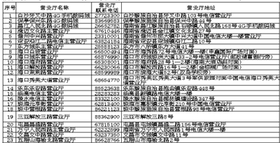 附:中国电信海南公司营业主厅列表