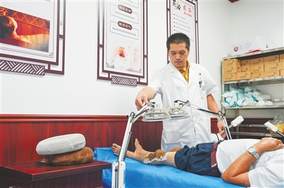 9月5日,在屯昌县屯城镇屯城卫生院的中医馆,中医师曾精才为患者进行隔物灸治疗。该卫生院设立中医康复科后,提供针灸推拿、隔物灸、刺络放血、刮痧拔罐等多种中医诊疗服务,每天都有不少患者前来问诊。
