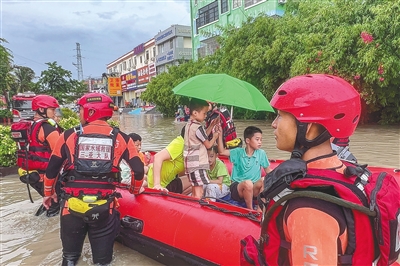 当天10时42分,三亚市吉阳区津海建材市场附近路段出现严重积水,附近多人被困,三亚消防救援人员携带冲锋舟、救生衣等救援装备出动后发现,此时水位不断上涨,被困人员共6人,其中有2名行动不便老人和4名儿童。随后,消防救援人员紧急驾驶橡皮艇前往,合力搀扶老人和孩子坐上橡皮艇,并成功将所有人员转移到安全区域。