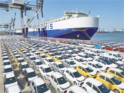 大批出口商品车集结山东港口烟台港准备通过汽车滚装船发运。新华社发