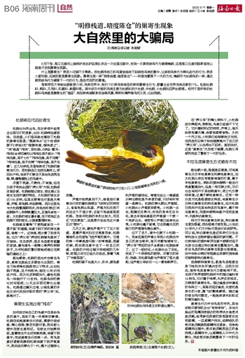 文\海南日报记者 张期望8月下旬,海口五源河公益保护地巡护监测队员在一次巡查过程中,发现一只黑领椋鸟代为哺育噪鹃,这是海口五源河国家湿地公园首次发现巢寄生现象。