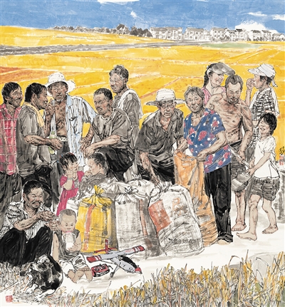 从此次展出的《红旗渠》局部作品中,可以看到画面人物的面容虽然布满皱纹,但精神状态却是饱满的。“作品的构图采取了蒙太奇表现手法,把所有的画面放在同一个平面中,体现出不同的场景。”王锐说。