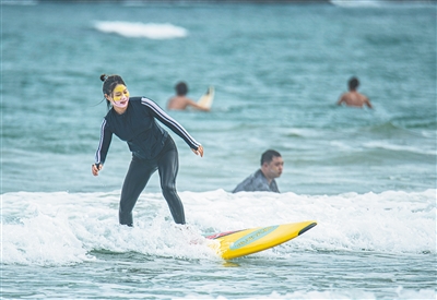 近日,游人在万宁日月湾体验冲浪的乐趣。