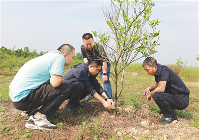 琼中黎族苗族自治县纪检监察干部在田间地头了解琼中绿橙种植、惠农补贴发放等情况。(朱德权 摄)