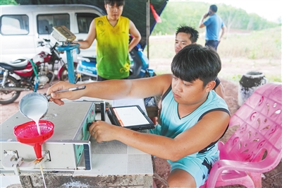 在白沙黎族自治县一处乳胶收购点,工作人员检测乳胶样本。