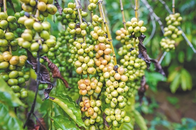 海南农垦母山咖啡标准化种植基地,一簇簇咖啡果实挂满枝头。