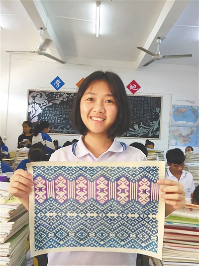 三亚市民族中学学生展示自己设计的黎锦纹样。受访者供图
