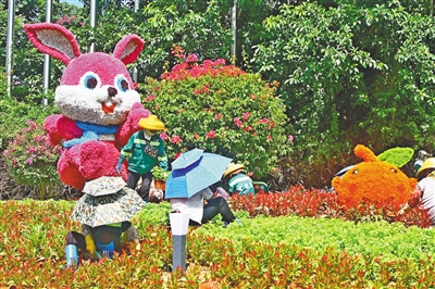 9月20日,三亚凤凰路美丽之冠路口,园林工人在赶着摆放鲜花,扮靓街头环境迎国庆。特约记者 孙清 摄