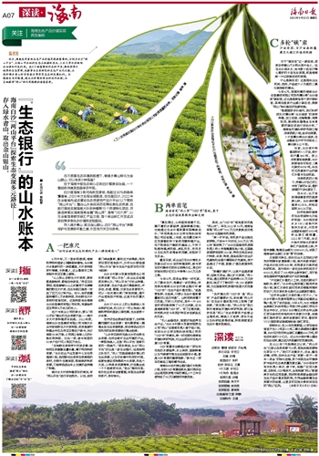 近日,海南发布首批生态产品价值实现典型案例,分别为白沙“两山平台”、五指山市永训村生态立体循环农业、三亚大茅水流域综合治理和开发利用。这3个典型案例所在的市县,都具有得天独厚的生态资源,也探索出各具特色的生态产业化之路,让保护绿水青山的百姓能分享实实在在的发展红利。本报推出系列报道,通过分析案例背后的运作机制,为各地探索“两山”转化思路提供借鉴参考。