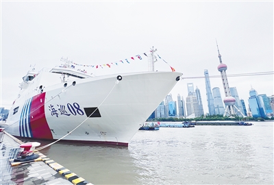 图为“海巡08”轮靠泊在上海黄浦江边。
