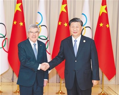 习近平强调,中国一贯重视发展体育事业,积极参与国际奥林匹克事务,践行“更快、更高、更强——更团结”的奥林匹克格言。去年中国克服新冠疫情等挑战,向世界奉献了一届“简约、安全、精彩”的北京冬奥会,北京成为全球首个“双奥之城”。中国传播奥林匹克精神的脚步永不停歇,愿同国际奥委会一道,坚持体育非政治化原则,充分利用北京冬奥会遗产,为推进奥林匹克事业和构建人类命运共同体作出新的更大贡献。目前,杭州亚运会的准备工作已经就绪。中国政府和中国人民完全有信心呈现一届“中国特色、亚洲风采、精彩纷呈”的体育盛会,为推动奥林匹克运动发展、促进亚洲人民团结和友谊作出新的贡献。