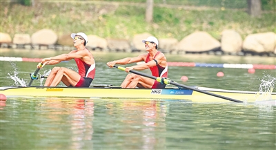 9月24日,杭州亚运会赛艇男子双人单桨无舵手决赛中,中国香港组合林新栋(右)、王玮骏以6分44秒20的成绩夺得冠军。新华社发