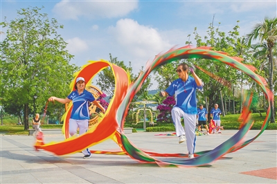 三亚河畔的白鹭公园,每天都吸引市民、游客前来晨练。 海南日报记者 王程龙 摄