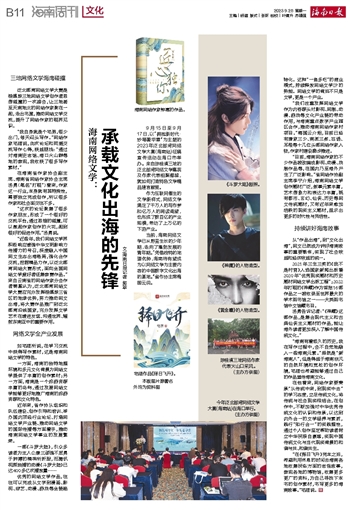 文\海南日报记者 郭萃9月15日至9月17日,以“拥抱新时代·妙笔著华章”为主题的2023年泛北部湾网络文学大赛(海南站)征稿宣传活动在海口市举办。来自琼桂滇三地的泛北部湾网络文学嘉宾及作家代表相聚椰城,就如何打造特色文学精品建言献策。