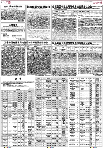 一、招租标的:(一)海口市华海路2号第三层铺面;(二)海口市龙华路海口市第一中学校区8号及9号铺面;(三)海口市龙华路24号房产大厦主楼一层2号铺面;(四)海口市大同一横路3号104号铺面。二、租赁期限:五年,以成交价作为第一年租金,以后每年租金递增3%,采用网络动态报价方式交易。三、公告期:2023年9月26日至2023年10月16日。详情请登录海南产权交易网(http://www.hncq.cn)、海南省公共资源交易网(http://zw.hainan.gov.cn/ggzy/)查询。联系方式:海口市国兴大道61号华夏银行大厦18楼海南产权交易所,电话:0898-66558038吴先生,海南省公共资源交易服务中心1楼受理大厅产权交易4号窗口,电话:0898-65237542陈女士。