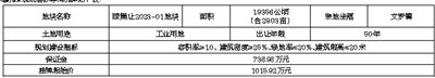 一、地块的基本情况和规划指标要求:本次挂牌出让的陵水县陵集让2023-01号地块位于陵水黎族自治县文罗镇文英村X662县道旁,总面积1.9356公顷(合29.03亩), 用地符合通过审查的《陵水黎族自治县文罗镇文英村村庄规划(2021—2035年)》,以及经批准启用的“三区三线”管控要求,不涉及占用永久基本农田、生态保护红线。其四至坐标详见《陵水县陵集让2023-01号地块勘测定界图》,土地用途为工业用地。该宗地概况及规划指标等情况详见下表: