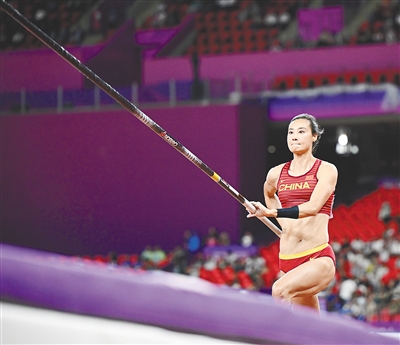 10月2日,在杭州亚运会田径项目女子撑杆跳高决赛中,中国选手李玲以4米63的成绩夺得冠军。图为李玲在比赛中。新华社记者 宋彦桦 摄