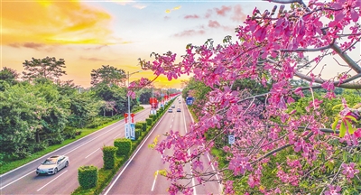 近日,在昌江黎族自治县石碌镇昌江大道,一株株异木棉树花团锦簇,仿佛为城市披上了一件“花衣裳”,浪漫而唯美。