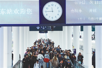 10月6日,在郑渝高铁南阳东站,旅客有序进站。(本版照片均由新华社发)