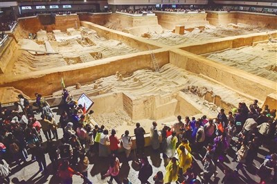 图③ 游客在西安秦始皇帝陵秦兵马俑二号坑遗址参观。