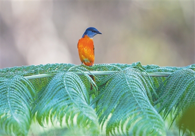 一只雄性灰喉山椒鸟站在海南热带雨林标志性植物桫椤叶片上。