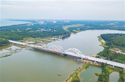 海南环岛旅游公路主线总里程988.2公里,串联沿途特色海湾、海角、特色小镇和旅游景区、滨海度假区等。海南环岛旅游公路临高段全长约58公里,目前主线路基段已建设完成,工人们正在对文澜江大桥进行桥面铺装、护栏、拱肋面漆喷涂等施工。新华社记者 蒲晓旭 摄