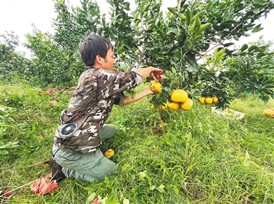 10月15日,在文英村葡萄柚种植基地,王学在采摘葡萄柚。