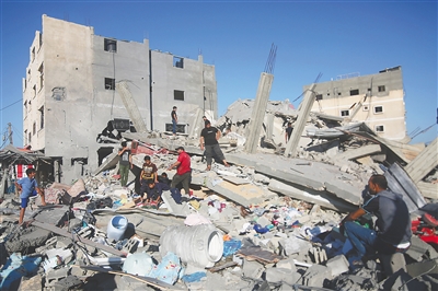图为在加沙地带南部城市拉法,人们站在遭以色列袭击的建筑废墟上。 新华社发