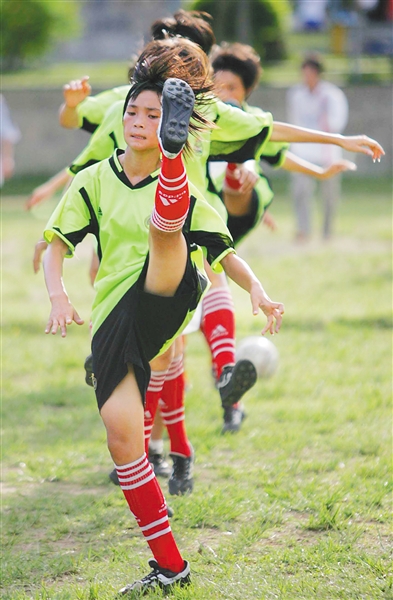 2006年,琼中女足成立之初,队员们在进行踢腿训练。符伟 摄