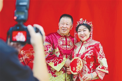 在山东省青岛市李沧区九水街道于家下河社区,摄影师为老人免费拍“结婚照”。