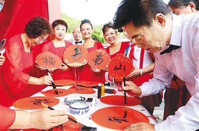海南三亚市老教授协会的老人们在南山景区创作书法作品。