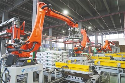 10月26日,在位于澄迈县的海南恒翔佳节能科技有限公司厂房内,机械臂在码放刚生产出来的产品。依托海南自贸港政策红利不断释放,该公司一期投资建设了可生产六大类40余种节能环保产品的生产线。目前,澄迈正积极打造低碳产业,通过引进新能源新材料产业链龙头企业,推动建链补链强链延链,实现产业绿色转型升级。本报记者 武威 高懿 图/文