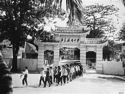 海南中学校门古朴典雅,上书“海南中学”四个大字,熠熠生辉。“海南中学”四字为何人所题?说来倒是一段文化佳话。