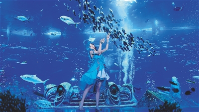 王者荣耀游戏角色扮演者在三亚·亚特兰蒂斯水族馆与鱼群合影,带给游客别样体验。