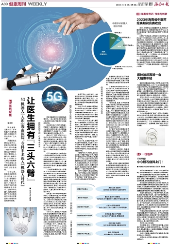 今年以来,我国自主研发的手术机器人也“入职”海南部分医院,借助5G技术,千里之外的医疗专家为海南患者成功手术。远程手术机器人和跨区域的医疗合作让老百姓不出岛也可享受到一线城市的优质医疗资源。