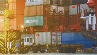 在洋浦小铲滩码头,工人正忙着装卸集装箱。本报记者 陈元才 摄