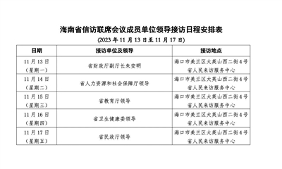 根据安排,省财政厅、省人力资源和社会保障厅、省教育厅、省卫生健康委、省民政厅相关负责人将分别于海南省海口市美兰区大英山西二街4号省人民来访服务中心接访群众。具体日程安排如下表。