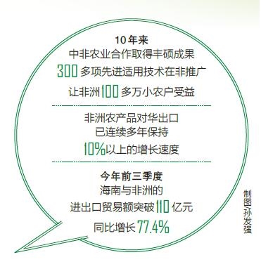 作为中国唯一的全域热带省份,海南与非洲诸多国家气候相近、资源相似、产业相配,双方合作空间大。《中非农业合作论坛三亚宣言》发布4年来,海南与非洲在农业科技、贸易投资等领域开展一系列交流与合作,结出了丰硕的果实。今年前三季度,海南与非洲的进出口贸易额突破110亿元,同比增长77.4%。