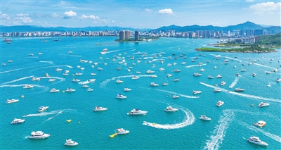 在三亚湾海域,游客乘游艇出海,体验水上娱乐项目。