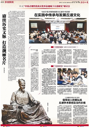 丘濬是生长于海南的明代名臣,一生著作众多,被誉为“有明一代文臣之宗”,其留下的诸多珍贵历史文化遗产是海南历史文化的代表性符号,也是中华优秀传统文化的重要组成部分。大家一致认为,要坚定文化自信,坚持守正创新,加强丘濬学术思想研究,深化对海南历史名人文化研究,讲好海南故事,进一步提升海南文化传播力、辐射力和影响力,向世界积极展示中华文化和中国风范。