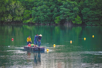 11月21日,省七届民族运动会工作人员在三亚河河面上加紧布置龙舟、独竹漂项目的赛道。